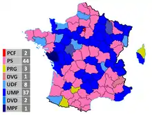 Cantonal elections to elect half the membership of the general councils of France's 100 departments were held on 21 and 28 March 2004. These elections coincided with the left's landslide in the regional elections held at the same time and also resulted in strong performances by the Socialist Party (PS) and its allies on the left, leaving the Socialists in control of a majority of departments.