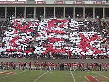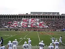 The practical joke was conceived of and coordinated by Michael Kai and David Aulicino, two Yale students in the class of 2005, and was executed with the help of 20 classmates disguised as the "Harvard Pep Squad". The perpetrators handed crimson-and-white placards to fans in the central area of the Harvard side of the stadium—mostly Harvard alumni, with a few faculty, students, and others. The group told the crowd that, by lifting the placards, they would spell "Go Harvard".[1][2][3]