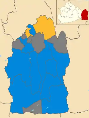 Map of the results of the 2006 Tandridge District Council election. Conservatives in blue and Liberal Democrats in yellow. Wards in grey were not contested in 2006.