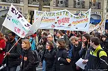 The Minister for Higher Education's two proposals relate to the status of university lecturers and doctoral candidates. For doctoral candidates, a "general doctoral contract" ("Contrat doctoral unique") would be introduced.[8] Without this, it would become impossible to obtain a doctorate at a French university. It would therefore become much more difficult for secondary school teachers to become university lecturers. Moreover, the draft law also included a possible obligation for doctoral candidates to perform additional duties (mostly administrative tasks), without further gain, while new contracts would facilitate the introduction of trial periods, thereby allowing university chancellors to dismiss doctoral candidates more easily.