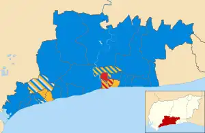 Map of the results of the 2007 Arun council election. Conservatives in blue, Liberal Democrats in yellow, Labour in red and Independent in grey.