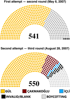 The first attempt consisted of the first rounds on 27 April and its repeat on 6 May after Turkey's constitutional court annulled the first round on 27 April. The constitutional court decided that a quorum of two-thirds was necessary, which was impossible without opposition support. Both first rounds were almost entirely boycotted by opposition MPs to disable the voting to start. Therefore, the ruling Justice and Development Party (AKP) was unsuccessful in electing its candidate, foreign minister Abdullah Gül. AKP then called a snap election which was held on 22 July 2007. The general elections saw it returned to government with a larger proportion of the vote. Subsequently, Gül was renominated and was finally elected in the third round of the second attempt of presidential election.[1] The first round of this voting was on 20 August, while a second was on 24 August and a third was on 28 August. There was a quorum this time, since some opposition parties, most importantly the Nationalist Movement Party (MHP), did not boycott the election.