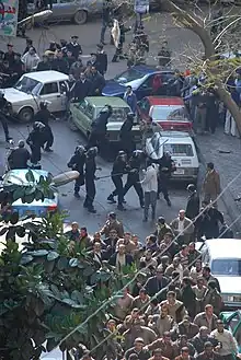 The strike at Mahalla was to have begun at 7 a.m. but plainclothes security personnel and police infiltrated the factory and allegedly intimidated workers from striking.[5] Hundreds of plainclothes security men took control of the Mahalla textile factories before work began, seizing workers and forcing them to work. At the end of the day, police escorts led small groups of workers out of the factories in an attempt to discourage mass protests.[6] This led some in the press to call the strike a failure and many left the region (about an hour outside Cairo) before any violence started.[7] Two people, including a 15-year-old-boy, were killed by Egyptian police, who used tear gas, rubber bullets, and live ammunition against the striking workers and other protesters.[8][9] Several leaders of opposition parties have been detained, including the Kifaya coordinator Mohamed el-Ashqar, Freedom Commission Rapporteur of the Labor Party Mohamed Abdel Kodous, prominent activist and Kifaya member Magdy Qarqar, and blogger Sharkawy[10] (who was sodomized and tortured by Egyptian police in 2006),[11] and others.[12]