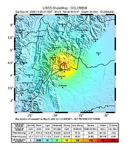 The 2008 El Calvario earthquake occurred in central Colombia on 24 May and measured 5.9 on the moment magnitude scale. The earthquake occurred at 2:20:43 p.m. (19:20:43 UTC) at the epicenter (El Calvario, Meta). The depth was 35 km; it was superficial according to an Ingeominas report. The epicenter was located 35 km from Villavicencio and 50 km from Bogotá. There were 11 confirmed fatalities and 4,181 injured, mostly in the towns of Puente Quetame, Fosca, Fomeque and Guayabetal in Cundinamarca, and in El Calvario, Meta.[3]