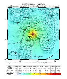 The 2008 Ziarat earthquakes hit the Pakistani province of Balochistan on October 29 with a moment magnitude of 6.4. The US Geological Survey reported that the first earthquake occurred 60 km (37 mi) north of Quetta and 185 km (115 mi) southeast of the Afghanistan city of Kandahar at 04:09 local time (28 October, 23:09 UTC) at a depth of 15 km (9.3 mi), at 30.653°N, 67.323°E.[4] It was followed by another shallower magnitude 6.4 earthquake at a depth of 14 km (8.7 mi) approximately 12 hours after the initial shock, at 30.546°N, 67.447°E.[5] 215 people were confirmed dead. More than 200 were injured (according to Mohammed Zaman, assistant to the Balochistan chief secretary, Nasir Khosa),[1][6][7] and 120,000 were homeless (according to Dilawar Khan Kakar, Ziarat, Balochistan mayor and chief administrator).[8][9] Qamar Zaman Chaudhry, director general of Pakistan Meteorological Department, stated the quake epicenter was 70 miles (110 km) north of Quetta,[10] and about 600 km (370 mi) southwest of Islamabad.[11]
