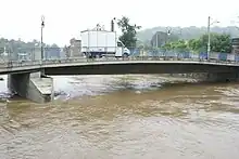 Overall, fourteen people died in the Czech Republic due to the impact of the flooding.[60] The Olomouc Region and the Moravian-Silesian Region were particularly affected in the drainage basins of the Oder and the Morava where numerous streets and rail lines were disrupted.[61]