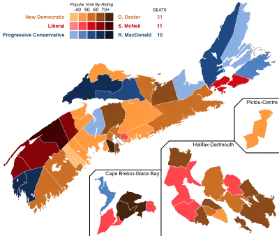 The 2009 Nova Scotia general election was held on June 9, 2009 to elect members of the 61st House of Assembly of the Province of Nova Scotia, Canada. The government was defeated on a money bill on May 4, and the Nova Scotia House of Assembly was dissolved by Lieutenant Governor Mayann Francis on May 5.[1] thereby triggering an election. The NDP won a majority government, forming government the first time in the province's history, and for the first time in an Atlantic Canadian province. The governing Progressive Conservatives were reduced to third place.