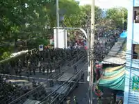 Thai soldiers in full combat kit fired live rounds and training rounds from automatic weapons to clear protesters from the Din Daeng intersection near the Victory Monument in central Bangkok, injuring at least 70 people.[10][11] The Army later claimed that live rounds were only fired into the air while training rounds were fired at the crowd. Human Rights Watch confirmed that there are some cases where the Army fired live ammunition directly at protesters.[12] Also on 13 April, Sean Boonpracong, the UDD's official international spokesman, gave a phone interview to Al-Jazeera English, admitting that some UDD protesters used hand guns during street protests though he claimed that the guns are used in defence of the military crackdown.[13] The UDD claimed one protester injured from gunshot wounds sustained during the military's attack.[14][15] However, the Army later claimed that the wound was not caused by an M-16, the standard Army rifle. Also on Monday the government ordered the blocking of satellite news station D Station, an affiliate of the UDD which, at the time, was broadcasting the clashes. Several UDD community radio stations were shut down and searched upon suspicion of being supporters of the UDD.[16] Violent clashes at numerous locations in Bangkok continued while arrest warrants were issued for Thaksin and 13 protest leaders.