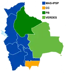 As of 12 April, MAS-IPSP had won the Mayor's race in 229 of the country's 337 municipalities.[11] However, among major cities (the departmental capitals plus El Alto) it won just three, Cochabamba, Cobija (Pando Department), and El Alto. Without Fear Movement candidates will be Mayors of La Paz (Luis Revilla) and Oruro. Regional candidates won in the following major cities: Jaime Barrón (PAÍS) in Sucre, Óscar Montes (Unidos para Renovar) in Tarija, Percy Fernández in Santa Cruz, Moisés Shriqui (Beni First) in Trinidad, and René Joaquino (Social Alliance) in Potosí.[12]