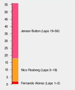 Several drivers, including Alonso, made pit stops for the intermediate compound tyres at the end of the second lap due to the intensifying rain.[39] Rosberg, Button and the Renaults of Kubica and Petrov chose to remain on the circuit and the former led the field back to racing speed when the safety car was withdrawn at the end of lap three. On the lap after, Kovalainen in seventh was passed by the eighth-placed Barrichello driving towards turn six. As Rosberg continued to pull away from Button on lap five, the stewards informed the Ferrari team that Alonso had jumped the start, for which he incurred a drive-through penalty.[36] He took the penalty on the next lap and rejoined the race in 14th.[35] Although the intermediate tyres initially provided an increase in speed, the rain did not intensify and every driver running on them made a second pit stop, providing Rosberg, Button, Kubica and Petrov with a significant lead over the rest of the field.[36] During this period, Hamilton got wheelspin and slewed sideways as he exited his pit stall alongside Vettel. The two made contact as the latter turned right and Hamilton veered close to the Williams mechanics before going behind Vettel.[40] Webber damaged the front wing after he hit the front jack. The incident cost him nine seconds and dropped him to tenth.[41] On lap nine, Hamilton passed Barrichello for 12th at turn one.[36] De La Rosa in fourth pulled off the side of the track on the same lap to retire with an engine failure.[39]