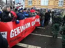 On January 19, 2010, police units searched premises used by the alliance in Dresden and Berlin, and confiscated computers, as well as posters. Politicians of the Left Party and the Green Party criticized the seizure.[7] According to the Prosecutors Office, the slogan "Gemeinsam blockieren" ("Blocking together"), used on the poster, constituted a call to violate the law.[8]