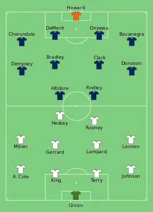 England took an early lead, Emile Heskey played a through ball to Steven Gerrard who slid the ball under Tim Howard in the 4th minute.[16] However, the Three Lions failed to build on their lead, with the U.S. having plenty of possession in the first half.[16] The United States equalised in the 40th minute when a seemingly harmless pot shot by Clint Dempsey was mishandled by England goalkeeper Robert Green and rolled into the net.[16] Early in the second half, Heskey was played through on goal but could only shoot straight at Tim Howard.[16] After several missed half-chances from England, Jozy Altidore forced a save onto the post from Green, highlighting England's lack of pace in central defence.[16] Post-match, the U.S.' manager Bob Bradley was full of praise for his team's performance.[20]