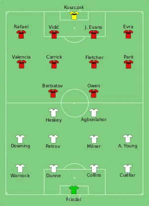 Aston Villa's team was as expected, with the possible exception of Friedel starting in goal ahead of Guzan. Martin O'Neill played a 4–4–2 formation with Heskey and Agbonlahor in attack and Ashley Young and Stewart Downing on the wings, while Stephen Warnock was deemed fit enough to play at left-back and Stiliyan Petrov recovered from his virus to captain the side from central midfield. The biggest surprise in the teams selected by both managers was Sir Alex Ferguson's decision to leave in-form striker Wayne Rooney on the bench, opting instead to partner Michael Owen with Dimitar Berbatov up front and play four in midfield. Also surprising was Ferguson's decision to play Tomasz Kuszczak in goal ahead of Edwin van der Sar, who had been rested in midweek.[24][25] It later came to light that Rooney had a minor knee injury and was named on the bench as a precaution.[26]