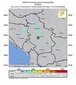 An earthquake of magnitude 5.5 and a maximum Mercalli intensity of VI (Strong) occurred on 3 November 2010 in central Serbia just several kilometers from the city of Kraljevo.[4] [5] The shock was felt across the country, including the capital Belgrade, and in neighboring countries. Two people were killed and over 100 suffered light injuries.[6][7] There were 5,967 structures that sustained some damage, 1,551 declared unsafe for use and require repairment, and 138 were damaged beyond repair.[8][9] There were more than 350 aftershocks, including a magnitude Mwr 4.3 earthquake on November 4.[10][11][12]