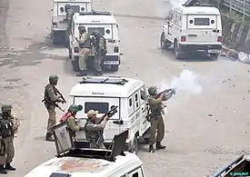 ![]() ![]() Top: Manipur commandos fire teargas shells to disperse protesters. Bottom: Emergency personnels extinguishing a burning security vehicle. | |