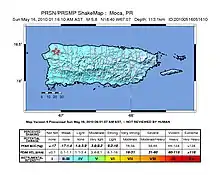 The 2010 Moca earthquake, also referred to as the 2010 Puerto Rico earthquake (Spanish: temblor de Puerto Rico de 2010), occurred on May 16 at 1:16 a.m. local time in Moca, Puerto Rico.[1] The earthquake measured 5.8 on the moment magnitude scale and had a maximum Mercalli intensity of VI (Strong). This was the largest earthquake to strike Puerto Rico since the 1943 Puerto Rico earthquake which measured 7.7 on the Richter scale.[2] This was also the first moderate to major earthquake in recorded history to originate on land in Puerto Rico, as earthquakes in the region usually have their epicenter in the ocean; another earthquake with an epicenter on land (in Aguas Buenas) would occur later in December of the same year.