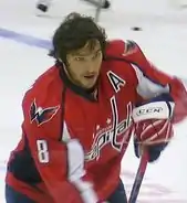 Washington continued its inconsistent play into the month of March, losing three games before going on a four-game winning streak leading up to another game against the Winnipeg Jets.[54] During the loss to the Jets, Vokoun re-aggravated a reoccurring groin injury; he had been dealing with the injury since late February, and it forced him out of the lineup.[57][58] Braden Holtby was recalled to serve as the team's back-up.[57] During Vokoun's absence, Ovechkin began a goal-scoring streak, notching nine goals in seven games, culminating in a two-goal performance during a 3–0 victory over the Minnesota Wild. The scoring steak helped Ovechkin to be named NHL's third star of the week. The win moved the Capitals into the eighth and final playoff spot.[59][60] They did not remain there long, however, as their next game was a lost 5–1 to the Buffalo Sabres, who passed Washington for eighth place.[61] The following game, against the Boston Bruins, Vokoun returned to action, but played only 18:25 before the same injury forced him from the game.[58] Although the Capitals won the game, it was Vokoun's final game of the season as well as his last as a Capital, with Vokoun later describing the injury as a "pretty severe [groin] tear."[62][63][64] Washington's final game of March marked the return of Nicklas Backstrom, who had missed 40 games with a concussion. The Capitals won the game 3–2 in a shootout, moving them back into eighth place.[65]