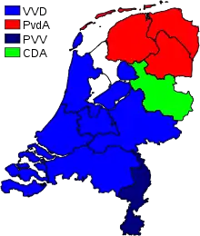 | VVD | PvdA | CDA | PVV | SP | D66 | GL | CU | SGP | 50+ | PvdD | remaining | total | |