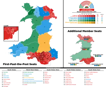 The election resulted in gains for the incumbent Welsh Labour, which gained four seats compared to the previous election and now has 30 seats, exactly half of the Assembly. The party also secured a swing in its favour of over 10 percentage points. The Welsh Conservatives emerged as the largest opposition party with 14 seats, a net gain of two, but party leader Nick Bourne lost his seat. The junior party in the government coalition, the nationalist Plaid Cymru, suffered a drop in its vote and lost 4 seats. The Welsh Liberal Democrats lost significantly in the popular vote and returned five AMs, a loss of one.[4]