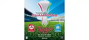The 2011 Trophée des champions (English: 2011 Champions Trophy) was the 16th edition of the French super cup. The match was to be contested by the winners of Ligue 1 the previous season, Lille, and the defending Coupe de France champions. However, due to Lille also winning the Coupe de France the previous season, the club faced the runners-up of the previous league campaign Marseille.[2] The match was played, for the third consecutive season, on international soil at the Stade de Tanger in Tanger, Morocco.[2] Like the previous two seasons, the idea was to promote French football abroad, but this time more specifically in Africa and the Arab world. The match was televised live on Canal+ in France and throughout 77 countries in the world, a new record for country viewership.[3] On 21 July 2011, it was confirmed by the Ligue de Football Professionnel that Bouchaïb El Ahrach would officiate the match.[4] Marseille trailed Lille by 3–1 with five minutes to go but came back to win 5–4.[5][6]