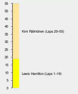 Racing resumed at the end of lap 14 when the safety car drove into the pit lane with Hamilton leading Räikkönen. Alonso drove slower than Webber, allowing the Red Bull driver to pull alongside Alonso, but the Ferrari driver maintained third position. Vettel moved up to 19th place after he overtook di Resta and de la Rosa.[24][28] Hamilton again started to pull away from Räikkönen. Vettel started to battle Grosjean for 17th position and during an overtaking manoeuvre, Vettel drove off the racing line and onto the run-off area, and was required to give 17th back to Grosjean to avoid being issued with a penalty. Vettel came back onto the circuit and passed Grosjean to take over the position.[30] Alonso began to close the gap to Maldonado who was running slower allowing Räikkonen to extend his hold over second place.[24] Vergne allowed Vettel to move into eleventh on lap 20.[28] Hamilton slowed and pulled over to the side of the track with a fuel pressure problem on the same lap, handing the lead to Räikkönen.[24][27] Alonso passed Maldonado in the second DRS zone by using his KERS system heading into the chicane to move into second one lap later.[28][30] Webber attempted to pass Maldonado by taking the outside line on lap 23, but the two drivers made contact with Webber spinning onto the run-off area. Both drivers were able to continue and Webber fell down to seventh.[28][30] When Räikkönen's engineer gave him information over the radio about the gap to second-place Alonso, he responded "Just leave me alone, I know what I'm doing". He later gave his Lotus team T-shirts with the phrase on, after it was widely covered in the media.[31]
