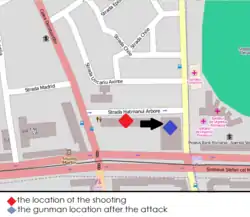 At around 17:40 EET, Gheorghe Vlădan entered the hairdressing salon Perla (English language: Pearl), located in the Dorobanți neighborhood in Sector 1, Bucharest, at the intersection of Calea Dorobanți and Iancu de Hunedoara Boulevard. He was armed with a 9×19mm Glock semi-automatic pistol. Vlădan opened fire, shooting eight people in total. He fired eleven bullets, from which three hit his wife. The rest of the bullets were fired at the victims, and all of them hit the targets.[3] At about 17:45, the shooter fled the scene and hid inside a public building. He turned himself in a few minutes after that.[4]