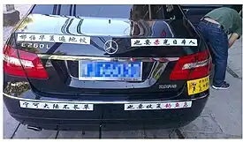 ![]() Anti-Japanese slogans marked on the back of a car - "Even if there are graves all over Huaxia, we must kill all the Japanese" (top) and "I would rather the grass not grow on the mainland, but recover the Diaoyu Islands" (bottom) | |||