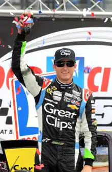 During qualifying, forty-four cars were entered, but only forty-three were able to start because of NASCAR's qualifying procedure.[11] Busch clinched his eleventh career pole position, with a record-setting[3] time of 14.813 seconds.[12] After his qualifying run, Busch commented, “The car felt great during that lap. We’ve never really worried too much about qualifying runs. We unloaded with a really good race car and we just kept fine-tuning to make it a little bit better – and we were able to get it where it was pretty quick in practice.”[3] He was joined on the front row of the grid by Kahne.[12] Hamlin qualified third, Brian Vickers took fourth, and Paul Menard started fifth, after being scored fifteenth in the final practice session.[12] McMurray, Keselowski, Tony Stewart, Martin Truex Jr., and Joey Logano completed the first ten positions on the grid.[12] The driver that failed to qualify was Scott Riggs.[12]