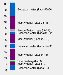 Maldonado, in 12th position, ran on a damp white line at turn 11 on lap 13; he drove across the gravel trap, removing half of his car's front wing. Maldonado recovered to the pit lane without external aid for a replacement front wing, and rejoined the race in 21st place.[40][41] By lap 15 Webber led teammate Vettel by 2.2 seconds, and Vettel was the same distance ahead of Hamilton in third.[39] Webber began the second round of pit stops when he entered the pit lane to switch to medium-compound tyres at the end of that lap; he returned to the track in fifth, behind Button.[39] Vettel took the lead and was instructed by his race engineer, Guillaume Rocquelin, to speed up to retain the position. He and Rosberg made their second pit stops at the end of lap 22. Vettel and Rosberg returned to the track in third and fourth place, and Webber returned to the lead.[41] A recurring captive wheel-nut system fault, possibly caused by a high temperature on the left front wheel, lost Sutil 84 seconds in a pit stop, and fell to 20th. Soon thereafter the Force India team called Sutil and his teammate, Di Resta, into retirement because they could not fix the problem before the end of the race and did not want to damage their cars.[39][49]