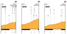 | Leith Hill (3rd Passage)[4] | 149.9 km (93.1 mi) | Cat 2 | 2.1 km (1.3 mi) | 139 m (456 ft) | 6.6% | 11.8% |