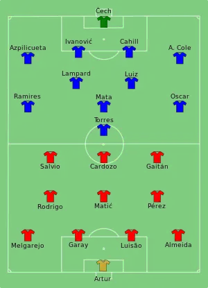 Fernando Torres put Chelsea ahead midway through the second half rounding the goalkeeper and clipping in after being put clean in on goal by Juan Mata. Óscar Cardozo equalised with a penalty eight minutes later awarded after Eduardo Salvio's header struck César Azpilicueta's hand. Branislav Ivanović scored in the final minute of stoppage time with a header into the far corner from a Mata corner from the right to clinch a 2–1 win for Chelsea and with it their first Europa League title.[7]