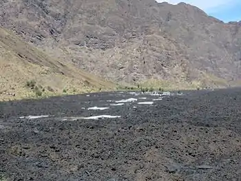On 27 November, a lava flow moved northward toward the village center.[4] During the first days of eruption, a 3.5 km stretch of the southern basalt paved road that connected São Filipe was covered with lava. On 1 December, the lava flow rate was 15 meters an hour and it had engulfed 400 ha of land, destroyed 18 houses and was nearing the village center.[5] A day later, lava entered into Portela where 50 houses were destroyed along with a school and a hotel.[6] By 7 December, much of Portela was ruined and 70% of Bangaeira had been damaged.[7] On 9 December, lava reached more areas inside the Bordeira and Bangaeira and by 12 December it affected almost all of Bangaeira.