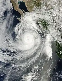 Continuing on a general northwestward trajectory, increased easterly wind shear caused the system to temporarily lose organization during the pre-dawn hours of September 4 as the low- and mid-level circulations became dislocated.[7] An Air Force Reserve Hurricane Hunter aircraft investigated Norbert that afternoon, recording peak flight-level winds of 97 mph (156 km/h), maximum surface winds of 90 mph (140 km/h), and a minimum barometric pressure of 970 mbar (970 hPa; 29 inHg).[8][9] Early on September 6, the cyclone began a period of unexpected rapid deepening; at 00:00 UTC, it was upgraded to a Category 2 hurricane,[10] and at 06:00 UTC, it intensified a major hurricane, a Category 3 hurricane on the Saffir-Simpson Hurricane Wind Scale.[11] After attaining its peak intensity with maximum winds of 125 mph (201 km/h) and a minimum pressure of 950 mbar (950 hPa; 28 inHg), Norbert began to track over cooler sea surface temperatures, and a weakening trend ensued. It was downgraded to a Category 2 hurricane at 21:00 UTC on September 6,[12] and further to a Category 1 hurricane at 03:00 UTC the next day.[13] Deep convection associated with Norbert began to wane significantly as the storm entered a stable environment, and a blend of satellite intensity estimates prompted the NHC to downgrade it to a tropical storm at 15:00 UTC.[14] At 09:00 UTC on September 8, after having been devoid of deep, organized convection for over 12 hours, the system was declared a post-tropical cyclone.[15] During the next few days, Nobert's remnants made a northward loop, before dissipating on September 11.[16]