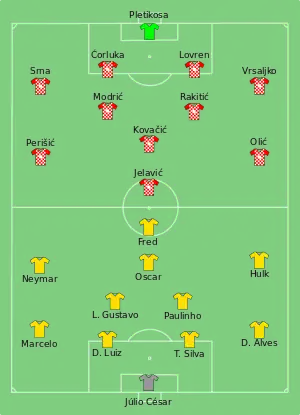 Croatia opened the scoring in the 11th minute through a Marcelo own goal, as the ball bounced off him into the net after Nikica Jelavić deflected Ivica Olić's cross.[3] Neymar equalized for the hosts with a 25-yard (23 m) shot after receiving a pass from Oscar.[4] In the second half, Brazil took the lead with Neymar's penalty after Dejan Lovren was controversially judged to have fouled Fred in the penalty area.[4] Croatia had a potential equalizer disallowed, after a foul was again controversially called on the Brazilian goalkeeper, Júlio César.[5][6][7] In added time, Oscar sealed the win, toe-poking the third goal for Brazil from 22 yards (20 m) after receiving a pass from Ramires.[4]