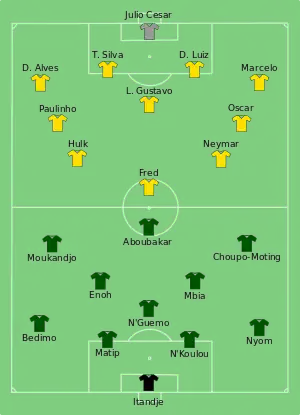 Brazil, where a draw would guarantee their qualification to the knockout stage, opened the scoring in the 17th minute when Luiz Gustavo crossed from the left for Neymar to beat the goalkeeper with a first time low side-footed finish to the corner.[37] Already-eliminated Cameroon equalised when Allan Nyom beat Dani Alves on the left before crossing for Joël Matip to finish from close range. Neymar put Brazil back in front when he collected the ball from Marcelo and ran at goal before finishing with a low right foot shot that wrong footed the goalkeeper from just inside the penalty area.[38] In the second half David Luiz crossed from the left for Fred to extend Brazil's lead with a close range header before half-time substitute Fernandinho completed the scoring when he collected a pass from Oscar before finishing with a low right footed shot.[39] The result assured that Brazil pipped Mexico on goal difference to qualify to the knockout stage as group winners.