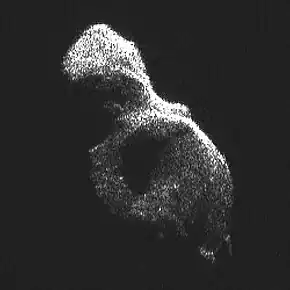 2014 HQ124 is a sub-kilometer asteroid, classified as near-Earth object and potentially hazardous asteroid of the Aten group, approximately 400 meters (1,300 feet) in diameter. It passed 3.25 lunar distances (LD) from Earth on 8 June 2014.[8] It was discovered on 23 April 2014 by NEOWISE.[2] It is estimated that an impact event would have had the energy equivalent of 2,000 megatons of TNT and would have created a 5 km (3 mi) impact crater.[9] The news media misleadingly nicknamed it The Beast.[10] 2014 HQ124 previously passed this close to Earth in 1952[8] and will not again until at least 2307.[11] Radar imaging suggests it may be a contact binary.[12]