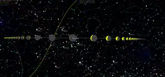 On 6 June 2014, the asteroid brightened to about apparent magnitude 13.7 while in the southern constellation of Horologium.[13] Near its closest approach to Earth of 3.25 lunar distances on 8 June 2014, the asteroid crossed the celestial equator, making it a northern hemisphere object. It however had an elongation of about 20 degrees from the Sun,[13] and was lost in astronomical twilight during the closest approach to Earth. The Goldstone Deep Space Network observed the asteroid later on 8 June 2014,[14] when the asteroid was between 3.6 and 3.8 lunar distances.[12]