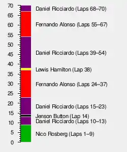 By lap 47, Rosberg had made further progress and was now almost a second behind Hamilton, with no cars separating them. Hamilton was given team orders to let Rosberg past, as Rosberg was on the softer tyre and had one more stop to make, while Hamilton was on a two stop strategy and did not have to pit again. However, Hamilton did not concede the place, replying on the radio: "I'm not slowing down for Nico. If he gets close enough to overtake, he can overtake me."[16] Hamilton was aware that he was effectively racing Rosberg at this point, and he did not want to lose a considerable amount of time by lifting to let his title rival through, as Rosberg was still over a second behind him.[17] Race-leader Ricciardo and Rosberg pitted for soft tyres on laps 54 and 56 respectively, rejoining in fourth and seventh. By lap 62, Alonso, Hamilton and Ricciardo were running very closely in first, second and third, with Hamilton 0.4 seconds behind Alonso and Ricciardo 0.4 seconds behind Hamilton. Meanwhile, Nico Rosberg was running fourth, over twenty seconds behind Ricciardo, but was rapidly closing the gap by up to three seconds a lap on his newer soft tyres, setting the fastest lap of the race while doing so. On lap 63, Alonso cut the chicane, but avoided any penalty and maintained the race lead. Ricciardo passed Hamilton around the outside of turn two on lap 67, and then the following lap passed Alonso at turn one for the race lead with two laps to go. Alonso continued to defend his position from Hamilton, but both of their tyres had fallen off of their respective operating cliffs – having both done close to 30 laps on their tyres – and by the final lap Rosberg had caught up to the back of them. Rosberg attempted to overtake Hamilton on the outside into turn two, but Hamilton defended and held position. Ricciardo crossed the line to win his second race of the season by 5.2 seconds, with Alonso coming second and Hamilton and Rosberg close behind in third and fourth.[15]