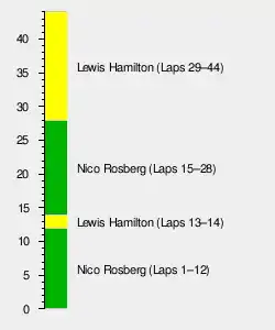 DRS was enabled on lap 24. Although Hamilton had closed Rosberg's lead to half a second and used DRS, he could not pass his teammate.[43] Räikkönen made a pit stop this lap,[44] which went wrong as his mechanics struggled to install a right-front wheel nut correctly. Hamilton tried to pass Rosberg again the following lap by running in his slipstream, but Rosberg held the line and had enough acceleration to defend first place. Hamilton held a tighter line, while Rosberg complained of more oversteer on lap 26.[41][43] On lap 27, Hamilton forgot to deactivate his DRS system and lost control of his rear; his brakes locked, and he went onto the turn one run-off area.[44][47] However, he caught up to Rosberg and ran closely behind his teammate into the hairpin without trying to pass.[43] Hamilton moved across the track during the lap in an attempt to pass;[44] Rosberg's car shuddered, and Hamilton got a better run onto the pit-lane straight. He was in Rosberg's slipstream before passing him on the outside heading into the first turn to take the lead on lap 29.[41][43][44] Hamilton pushed hard and pulled away from Rosberg, who lost control heading into the pit-lane straight.[43]