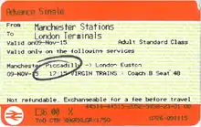 The report noted that although "passengers [were] comfortable with the familiar format" of the 30-year-old design, it had significant disadvantages.[8] Passengers wanted the most important data—station names, ticket descriptions, permitted routes, time restrictions and validity information—presented more clearly, in larger print, without jargon and with as little abbreviation as possible. In particular, there was a desire for Advance tickets (cheap tickets valid only on a specific train) to show their restrictions and accompanying reservation details more clearly on the same ticket rather than on a separate reservation coupon.[6][9] The report stated that although the Department for Transport's long-term intention was for printed tickets to be replaced with smart cards,[6][10] the rail industry would soon launch a "cleaner, fresher and updated" ticket design which was intended to address some of these suggestions.[11]