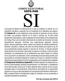 A constitutional referendum, officially referred to as the referendum to lower the age of criminal responsibility (Spanish: plebiscito para bajar la edad de imputabilidad), was held in Uruguay on 26 October 2014, alongside general elections. Voters were asked whether Article 43 of the Constitution should be amended to lower the age of criminal responsibility from 18 to 16.[1] The proposal was rejected by 53% of voters.