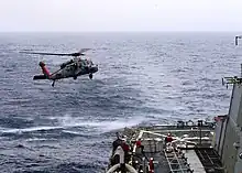 Mediterranean Sea (16 March 2014) An MH-60S Sea Hawk helicopter assigned to Helicopter Sea Combat Squadron (HSC) 9 prepares to land on the flight deck of the guided-missile destroyer USS Ramage (DDG 61). Ramage is on a scheduled deployment supporting maritime security operations and theater security cooperation efforts in the U.S. 6th Fleet area of operations. (U.S. Navy photo by Mass Communication Specialist 2nd Class Jared King/Released) 140316-N-CH661-111