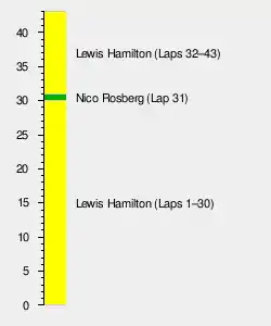 An early pit stop by Ricciardo on lap eight forced the hand of Force India, who brought in Pérez one lap later, but Pérez still came out behind the Red Bull. Several more drivers came in over the next couple of laps, including Bottas and Grosjean, with the Williams taking back his position during the stops only to be overtaken again on lap ten. Bottas was also set for a penalty, as his team had simultaneously equipped him with two different types of tyre compounds. He would later serve a drive through penalty.[48] Lap eleven saw a risky overtaking manoeuvre by Max Verstappen, who went around the outside of Nasr at Blanchimont to take eleventh place.[47] Following these first stops, the order at the front was Hamilton, Rosberg, Vettel, Räikkönen and Ricciardo, with the first four yet to stop. Rosberg was the first to do so on lap 13, coming out slightly ahead of Pérez, who had overtaken Ricciardo a lap earlier. Pérez carried his momentum into Eau Rouge and up to turn seven, but ultimately failed to get the better of the Mercedes. Hamilton and Vettel made pit stops for new tyres on laps 14 and 15 respectively.[48]