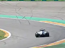 Another accident marred the second practice session on Friday afternoon, when a rear tyre on Nico Rosberg's Mercedes blew, causing him to spin in the run-up to Blanchimont corner. Rosberg was able to avoid hitting the tyre barriers, but the session was nevertheless red-flagged in order to clear the track of the car. Prior to this incident, Rosberg had set the fastest time of the session with 1:49.687, three-tenths of a second faster than teammate Hamilton, in second. Ricciardo was again third, a further 0.4 seconds adrift, ahead of fellow Red Bull driver Daniil Kvyat, one second behind Rosberg. The Williams cars of Valtteri Bottas and Felipe Massa were 14th and 16th respectively, ahead of the two McLaren drivers, who were faster only than the two Manor Marussia cars.[30] Rosberg's tyre failure was later deemed the result of an "external cut", excluding the possibility of "any structural integrity issues".[31] Rosberg however remained worried about the reliability of the tyres for Sunday's race, saying: "The problem is that we don't really understand it. There are theories but there is no real evidence, so that's a bit worrying for sure."[32]