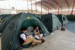 ![]() Images from top, left and right: Colombian National Police assisting refugees with their belongings. An elderly Colombian refugee being carried by a Colombian National Police officer. Colombian refugees in a makeshift shelter seeking shade. | |