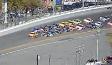 Kyle Busch was the fastest in the third practice session with a time of 44.826 and a speed of 200.776 mph (323.118 km/h).[26] During this session, there was a four car wreck on the backstretch that involved Michael Annett, Jeb Burton, Denny Hamlin and Danica Patrick.[27] It started when Hamlin pulled out of line and Patrick tried to follow him, but made contact with the right-front corner of Hamlin's car when she over-corrected and hit the wall. Michael Annett tried to go high around Patrick on the outside when he got turned by Jeb Burton. Patrick, Annett and Burton all switched to backup cars.[27] After the incident, Patrick stated that her car "sort of just started turning toward the right, the back end was coming around and it swapped ends" and that Hamlin was trying to "make a third lane in the middle and it felt like it must have caught my bumper".[27] Hamlin felt that Patrick had intended to block his path, stating that a driver has "to give a little bit of extra room in practice" and that if he "had to guess, she probably saw in her mirror that I was going down there and tried to stay in front of me".[27]