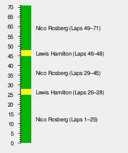On lap 48, Mercedes changed strategies, bringing in both drivers for another tyre stop, much to the dismay of Lewis Hamilton, who complained to his team over the radio. Meanwhile, a fight developed between Massa and Ricciardo for fifth place, with the latter making the pass at the beginning of lap 53. On the same lap, Sebastian Vettel spun once more at turn seven, this time hitting the barriers, ending his race and bringing out the safety car. The double retirement marked the first time since the 2006 Australian Grand Prix that none of their cars were classified.[21] During the caution period, the order stood as: Rosberg, Hamilton, Kvyat, Bottas, Ricciardo, Massa, Hülkenberg, Pérez, Verstappen and Grosjean. At the restart at the beginning of lap 58, Bottas made a move on Kvyat into turn one, taking third place. Over the last laps of the race, Hamilton was able to close on Rosberg, as was Massa on the two Red Bull drivers ahead of him. However, neither were able to overtake, and Rosberg crossed the finish line to take victory, followed by Hamilton and Bottas.[19][20]