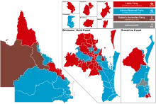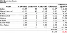 Wellington announced on 5 February he would support a Palaszczuk-led Labor minority government on confidence and supply while retaining the right to vote on conscience.[4] On 13 February, the Electoral Commission of Queensland declared the results of the election. Labor won 44 seats, one short of a majority, putting Labor in a position to form a minority government in the hung parliament.[5][6][7] Even allowing for the LNP's previously overwhelming majority, the 37-seat swing is the second-largest shift of seats against a sitting government in Queensland since Federation, only exceeded by the 44-seat shift against Labor in 2012. Conversely, the two-party swing of 13.7 points in 2012 was exceeded by the 2015 two-party swing of 14.0 points.