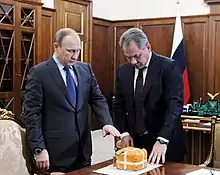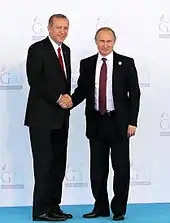 A few hours after the incident, Russian President Vladimir Putin spoke from Sochi, where he was meeting with King Abdullah II of Jordan, saying that it was a "stab in the back by terrorist accomplices,"[51][91] that Russia would not put up with attacks like this one[45] and that Russia–Turkey relations would be affected. Foreign Minister Sergey Lavrov was due to visit Turkey the next day, and Turkish President Recep Tayyip Erdoğan had scheduled a visit to Russia later in the year.[92][93][94] Lavrov cancelled his trip after the incident.[89] Lieutenant General Sergey Rudskoi said that forces threatening Russia would be targeted. Protesters pelted the Turkish embassy in Russia with eggs before police cleared the area.[95] On 26 November, Prime Minister Dmitry Medvedev announced broad economic sanctions against Turkey that would affect their joint investment projects,[96] including the possible shelving of a multibillion-dollar deal to build Turkish Stream gas pipeline through Turkey.[97] Chechen leader Ramzan Kadyrov said that Turkey would regret its actions.[98] Putin accused Turkey of helping ISIL in the illegal oil trade, saying that funds from the sale of oil were used to support terrorists.[99] The Russian Air Force had recently started bombing the oil tankers en route to other countries, including Turkey, and the infrastructure for processing and storage of crude oil.[100][101] Putin later claimed that the Turkish shoot-down was an "ambush" that had been prepared in advance.[102] A bill making denial of the Armenian genocide illegal has been introduced in the Russian State Duma.[103]