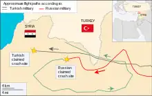According to Turkey's statement to the UN Security Council, two aircraft, whose nationalities were unknown at the time, violated Turkish airspace up to a depth of 2.19 km (1.36 mi) for about 17 seconds.[3][56] According to Turkish officials, the aircraft were given 10 warnings within the span of 5 minutes, by operators at a ground-controlled interception station, to change their course.[51] Turkey later released the audio recording ("The unknown air traffic position to Humaymim 020 radial 26 miles. This is Turkish Air Force speaking on Guard. You are approaching Turkish airspace, change your heading south immediately").[57][58][59] The Russians claim there were no warnings.[60] Analysts have noted that Turkey's warnings were issued on a dedicated mutually-agreed radio channel, which was the international Guard (emergency) channel (243.0 MHz), but the R-862M radio fitted to the Su-24M is not able to monitor this channel without optional equipment, which may not have been installed.[61][62] According to Turkey, one aircraft left Turkish national airspace after violating it; the other aircraft was fired upon by Turkish F-16s patrolling the area and crashed into Syrian territory after being hit in Turkish airspace.[3] Based on its heat signature, an anonymous American official stated that the jet was hit in Syrian airspace after a short incursion into Turkey.[63] On 30 November, US Ambassador to NATO Douglas Lute stated that the data supported the Turkish version of events.[64]